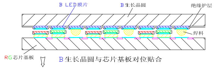 完成R LED膜片以及G LED膜片轉(zhuǎn)移得到的RG芯片基板,再與B生長晶圓對位貼合,進(jìn)行B LED膜片的晶圓級規(guī)模轉(zhuǎn)移,得到RGB芯片基板。