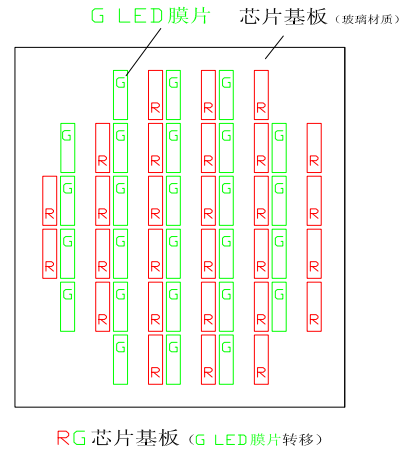 完成R LED膜片轉(zhuǎn)移的芯片基板,再與G生長晶圓對位貼合,進(jìn)行G LED膜片的晶圓級規(guī)模轉(zhuǎn)移,得到RG芯片基板。