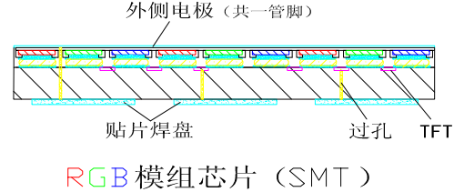 外側(cè)電極通過側(cè)壁引線與貼片焊盤導(dǎo)通,外側(cè)電極共一貼片焊盤,薄膜晶體管(TFT)驅(qū)動電路通過過孔與貼片焊盤導(dǎo)通。