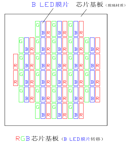 RGB芯片基板需要經(jīng)過三次(R、G、B)晶圓級規(guī)模LED膜片轉(zhuǎn)移。