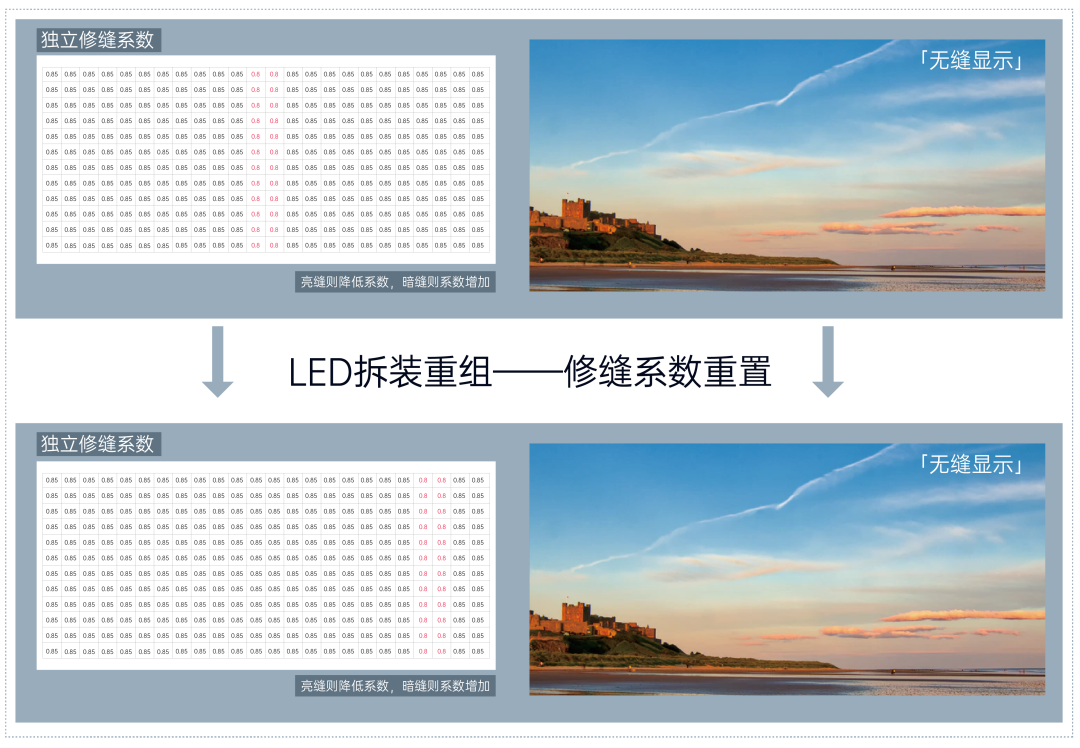 針對(duì)不同的應(yīng)用場(chǎng)景及需求,卡萊特通過(guò)啟用多重系數(shù)的方式靈活控制LED燈珠亮度,提供普通修縫和高級(jí)修縫兩種解決方案,搭配軟件的實(shí)時(shí)智能操作,輕松告別修縫煩惱。