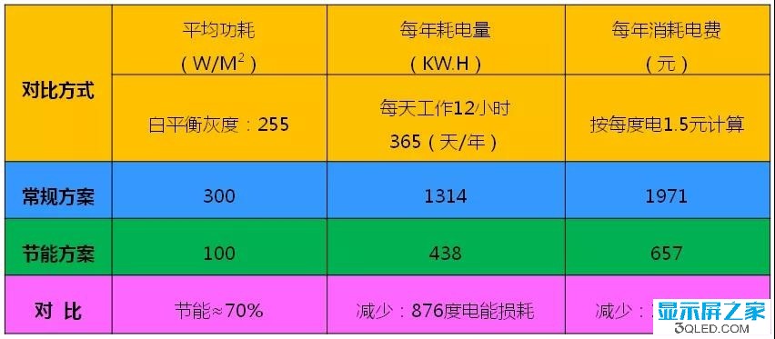 綜合采用LED節(jié)能方案產(chǎn)品對比普通產(chǎn)品,每平米每年可節(jié)約876度電能,按1.5元/度電費(fèi)計(jì)算,每平米每年可節(jié)約1314元,如下表(采用P10-1平米進(jìn)行對比數(shù)據(jù)):4SvLED顯示屏廠家|江蘇迷你光電有限公司