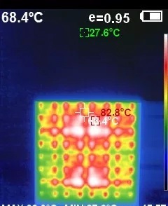 此時共陽顯示屏與共陰冷屏平均溫度相差約18℃,通過紅外熱像儀屏幕捕獲到的圖像可以看出,共陽顯示屏表面高溫區(qū)域呈點狀分布;而共陰冷屏表面溫度分布較為平均。