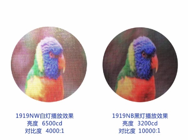 1919NB黑燈(右)10000:1的超高對比度,即使只有3200cd的亮度,但在戶外陽光直射下,依然能夠完美顯示。畫面細膩、柔和,更加適合人眼觀看。可見,高對比度對于戶外顯示尤為重要。