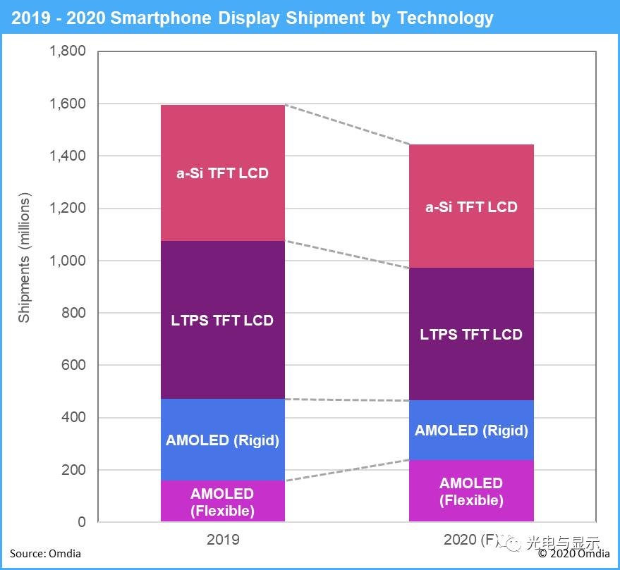 Omdia預(yù)計(jì)2020年智能手機(jī)用AMOLED總出貨量為4.66億片,較2019年同比微降1%。憑借高顯示性能(高對(duì)比度和低功耗),AMOLED的出貨量在2019年得到了強(qiáng)勁增長(zhǎng),取代了高端智能手機(jī)對(duì)LTPS TFT LCD的需求。
