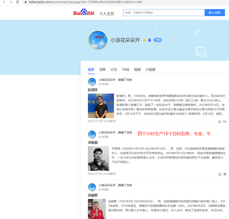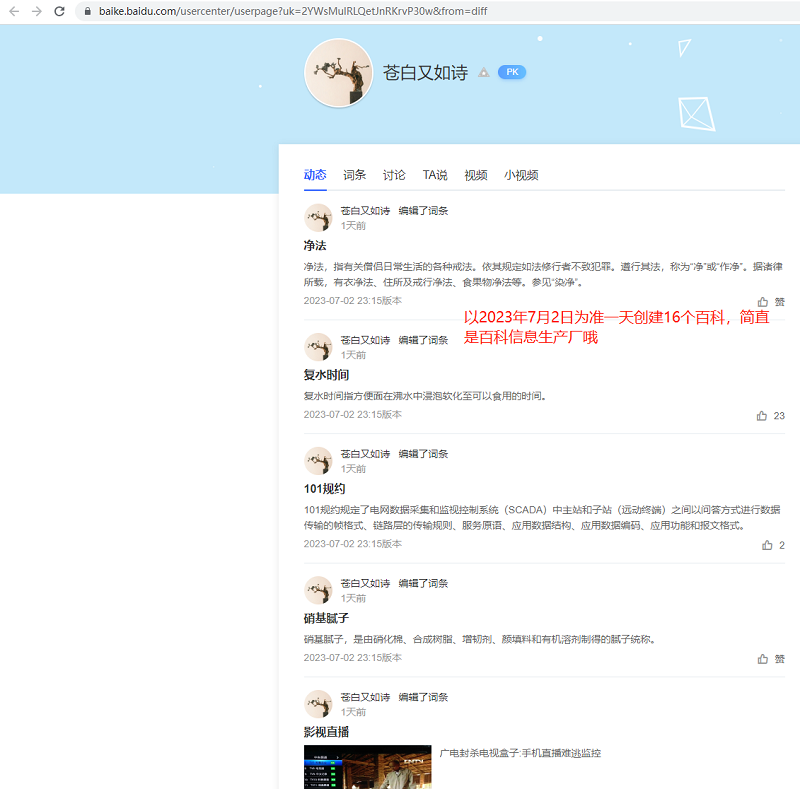 當小編們打開第一個百科創(chuàng)作者蒼白又如詩時驚掉小編的下巴,這哥們一天之間2023年7月2日當天創(chuàng)建了16個百科詞匯,再看下另外一個賬號浪花朵朵開更厲害四個小時創(chuàng)建了15個詞匯,難道這就是業(yè)內傳說的專業(yè)“賣詞人”?大家可以看下包含了各行各業(yè)的詞匯,到了這里各位評估下,這種賬號的信息可信度有多少呢?這個小編不說了大家自己腦補。。。。。