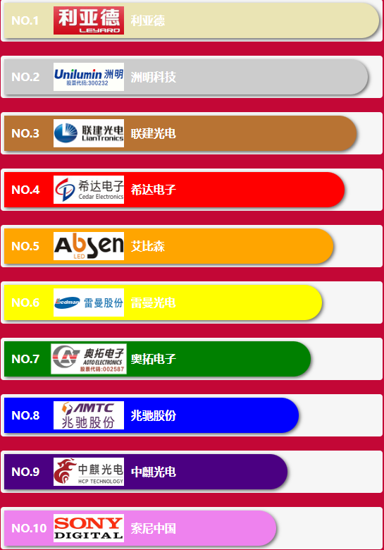 小間距十大品牌十大品牌前10名企業(yè)分別為:利亞德,洲明科技,聯(lián)建光電,希達電子,艾比森,雷曼光電,奧拓電子,兆馳股份,中麒光電,索尼中國。Mini & Micro