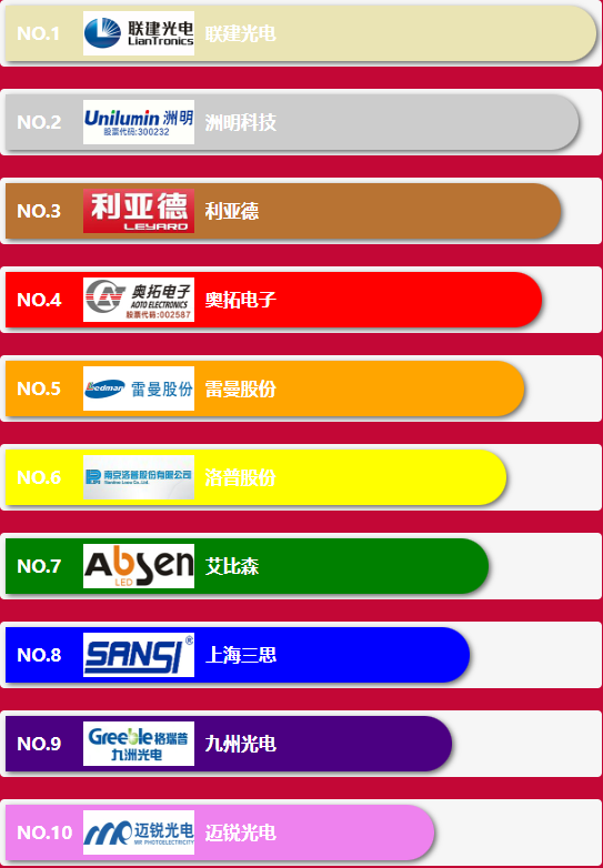 led顯示屏工程應用十大品牌前10業(yè)分別為:洲明科技,利亞德,聯(lián)建光電,奧拓電子,雷曼股份,洛普股份,艾比森,上海三思,九州光電,邁銳光電