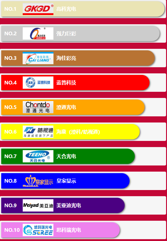 led顯示屏十大品牌排行榜細分為5大類分別有:機械創(chuàng)意大屏十大品牌排行榜,中低端走量大屏十大品牌排行榜,Mini & Micro